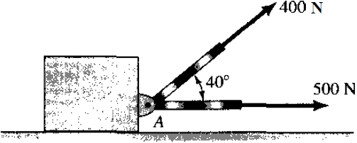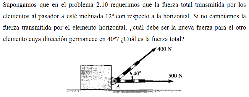Supongamos que en el problema 2.10 requerimos que la fuerza total transmitida por los elementos al pasador A esté inclinada 12º con respecto a la horizontal. Si no cambiamos la fuerza transmitida por el elemento horizontal, ¿cuál debe ser la nueva fuerza para el otro elemento cuya dirección permanece en 40º? ¿Cuál es la fuerza total?