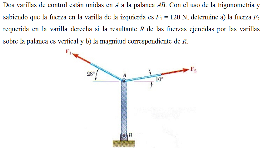 Dos varillas de control están unidas en A a la palanca AB. Con el uso de la trigonometría y sabiendo que la fuerza en la varilla de la izquierda es F1 = 120 N, determine a) la fuerza F2 requerida en la varilla derecha si la resultante R de las fuerzas ejercidas por las varillas sobre la palanca es vertical y b) la magnitud correspondiente de R.