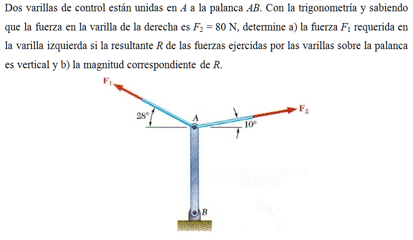 Dos varillas de control están unidas en A a la palanca AB. Con la trigonometría y sabiendo que la fuerza en la varilla de la derecha es F2 = 80 N, determine a) la fuerza F1 requerida en la varilla izquierda si la resultante R de las fuerzas ejercidas por las varillas sobre la palanca es vertical y b) la magnitud correspondiente de R.