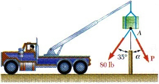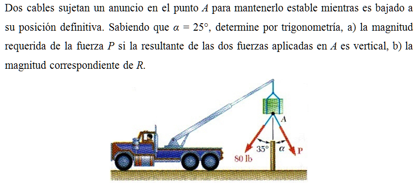 Dos cables sujetan un anuncio en el punto A para mantenerlo estable mientras es bajado a su posición definitiva. Sabiendo que α = 25°, determine por trigonometría, a) la magnitud requerida de la fuerza P si la resultante de las dos fuerzas aplicadas en A es vertical, b) la magnitud correspondiente de R.