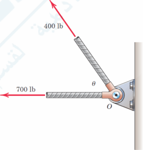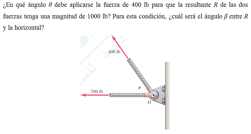 ¿En qué ángulo θ debe aplicarse la fuerza de 400 lb para que la resultante R de las dos fuerzas tenga una magnitud de 1000 lb? Para esta condición, ¿cuál será el ángulo β entre R y la horizontal?