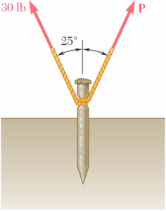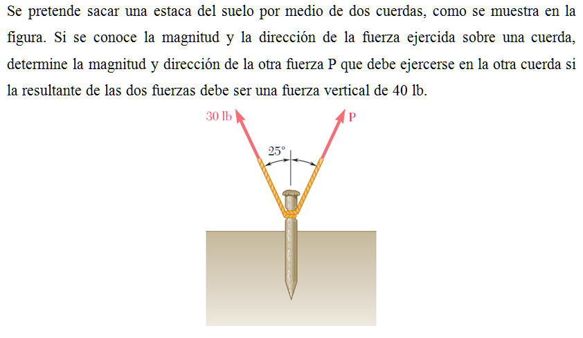 Se pretende sacar una estaca del suelo por medio de dos cuerdas, como se muestra en la figura. Si se conoce la magnitud y la dirección de la fuerza ejercida sobre una cuerda, determine la magnitud y dirección de la otra fuerza P que debe ejercerse en la otra cuerda si la resultante de las dos fuerzas debe ser una fuerza vertical de 40 lb.