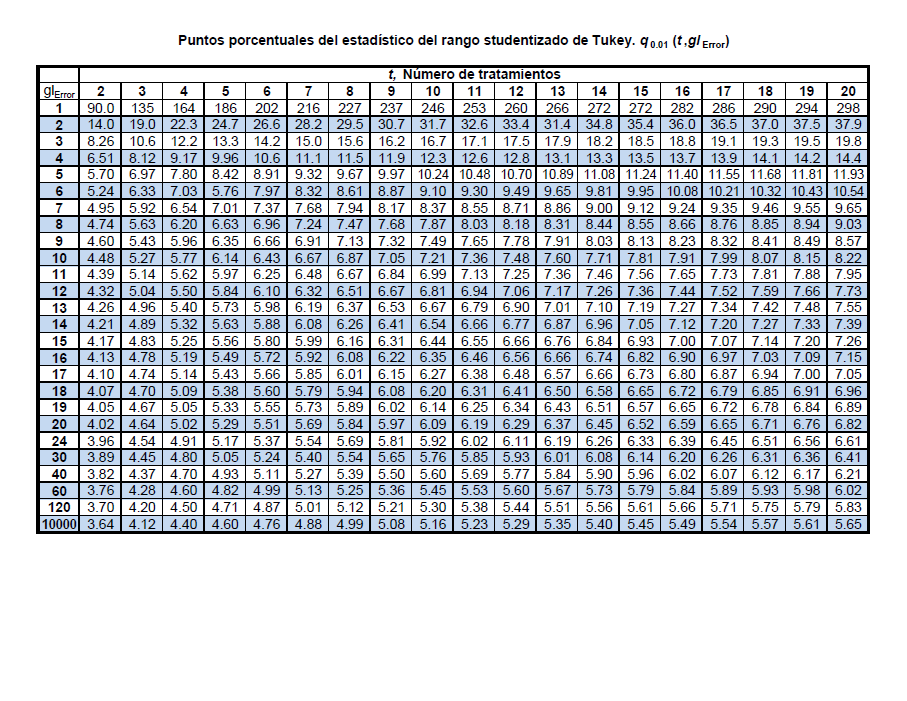 Tabla del rango studentizado de Tukey.