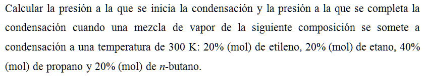 Calcular la presión a la que se inicia la condensación y la presión a la que se completa la condensación cuando una mezcla de vapor de la siguiente composición se somete a condensación a una temperatura de 300 K: 20% (mol) de etileno, 20% (mol) de etano, 40% (mol) de propano y 20% (mol) de n-butano.