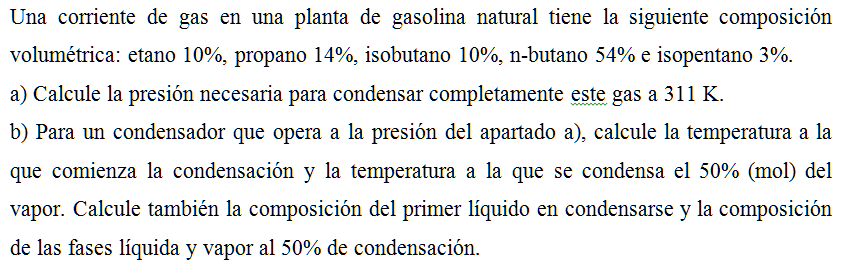 Una corriente de gas en una planta de gasolina natural tiene la siguiente composición volumétrica: etano 10%, propano 14%, isobutano 10%, n-butano 54% e isopentano 3%.