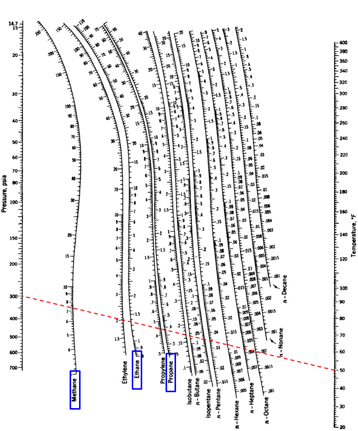 A P = 300 psia y T = 50°F de los diagramas de DePriester: