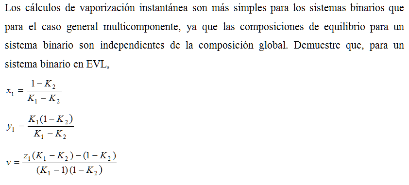 Los cálculos de vaporización instantánea son más simples para los sistemas binarios que para el caso general multicomponente, ya que las composiciones de equilibrio para un sistema binario son independientes de la composición global. Demuestre que, para un sistema binario en EVL,