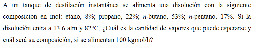 A un tanque de destilación instantánea se alimenta una disolución con la siguiente composición en mol: etano; 8%, propano, 22%; n-butano, 53%; n-pentano, 17%. Si la disolución entra a 13.6 atm y 82°C, ¿Cuál es la cantidad de vapores que puede esperarse y cuál será su composición, si se alimentan 100 kgmol/h?