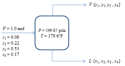 Vapor: y1 = 0.151138; y2 = 0.313814; y3 = 0.457316; y4 = 0.077736.