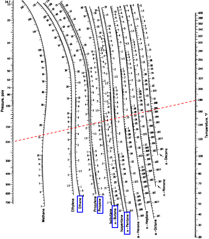 A P = 199.85 psia y T = 179.6°F, de los diagramas de DePriester: