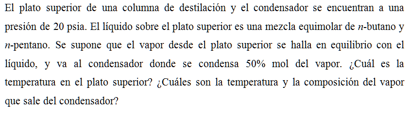 El plato superior de una columna de destilación y el condensador se encuentran a una presión de 20 psia. El líquido sobre el plato superior es una mezcla equimolar de n-butano y n-pentano. Se supone que el vapor desde el plato superior se halla en equilibrio con el líquido, y va al condensador donde se condensa 50% mol del vapor. ¿Cuál es la temperatura en el plato superior? ¿Cuáles son la temperatura y la composición del vapor que sale del condensador?