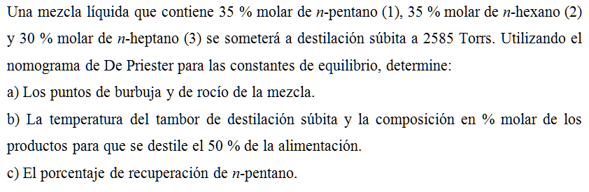 Una mezcla líquida que contiene 35 % molar de n-pentano (1), 35 % molar de n-hexano (2) y 30 % molar de n-heptano (3) se someterá a destilación súbita a 2585 Torrs. Utilizando el nomograma de De Priester para las constantes de equilibrio, determine: