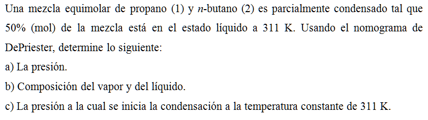 Una mezcla equimolar de propano (1) y n-butano (2) es parcialmente condensado tal que 50% (mol) de la mezcla está en el estado líquido a 311 K. Usando el nomograma de DePriester, determine lo siguiente: