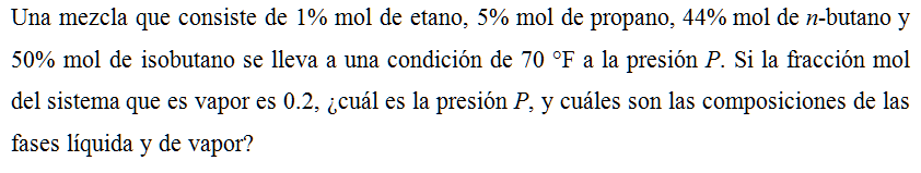 Una mezcla que consiste de 1% mol de etano, 5% mol de propano, 44% mol de n-butano y 50% mol de isobutano se lleva a una condición de 70 °F a la presión P. Si Problema 10.31 del Smith – Van Ness Séptima Ediciónla fracción mol del sistema que es vapor es 0.2, ¿cuál es la presión P, y cuáles son las composiciones de las fases líquida y de vapor?