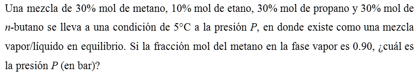 Una mezcla de 30% mol de metano, 10% mol de etano, 30% mol de propano y 30% mol de n-butano se lleva a una condición de 5°C a la presión P, en donde existe como una mezcla vapor/líquido en equilibrio. Si la fracción mol del metano en la fase vapor es 0.90, ¿cuál es la presión P (en bar)?