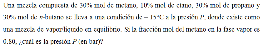 Una mezcla compuesta de 30% mol de metano, 10% mol de etano, 30% mol de propano y 30% mol de n-butano se lleva a una condición de –15°C a la presión P, donde existe como una mezcla de vapor/líquido en equilibrio. Si la fracción mol del metano en la fase vapor es 0.80, ¿cuál es la presión P (en bar)?