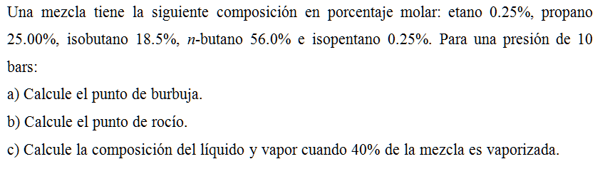 Una mezcla tiene la siguiente composición en porcentaje molar: etano 0.25%, propano 25.00%, isobutano 18.5%, n-butano 56.0% e isopentano 0.25%. Para una presión de 10 bars: