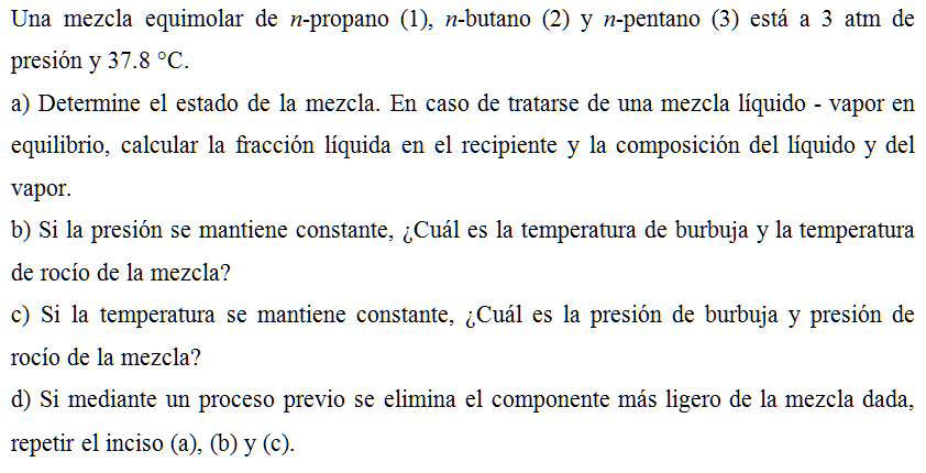 Una mezcla equimolar de n-propano (1), n-butano (2) y n-pentano (3) está a 3 atm de presión y 37.8 °C.