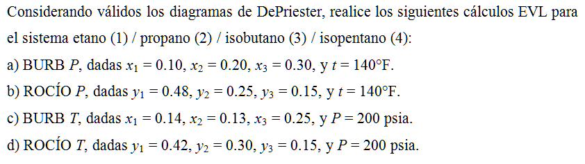 Considerando válidos los diagramas de DePriester, realice el siguiente cálculo EVL para el sistema etano (1) / propano (2) / isobutano (3) / isopentano (4):