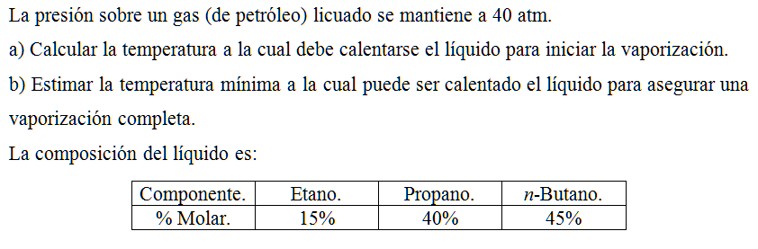 b) Estimar la temperatura mínima a la cual puede ser calentado el líquido para asegurar una vaporización completa.