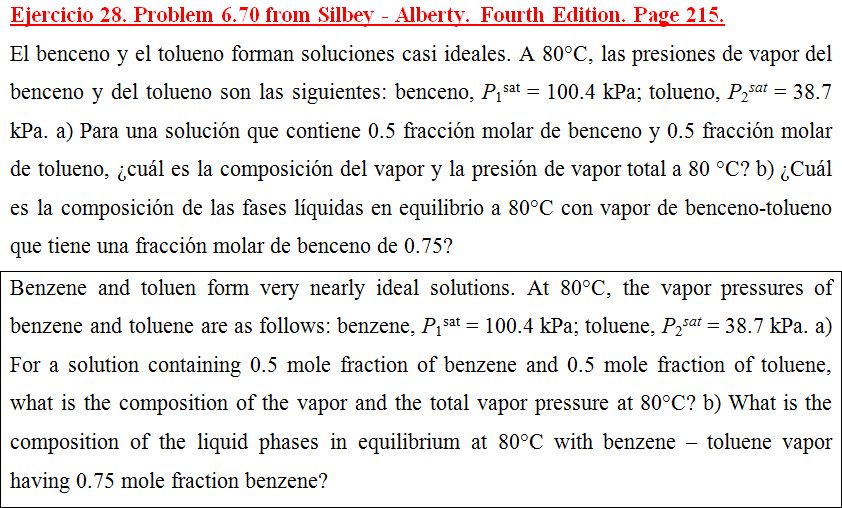 El benceno y el tolueno forman soluciones casi ideales. A 80°C, las presiones de vapor del benceno y del tolueno son las siguientes: benceno, P1sat = 100.4 kPa; tolueno, P2sat = 38.7 kPa. a) Para una solución que contiene 0.5 fracción molar de benceno y 0.5 fracción molar de tolueno, ¿cuál es la composición del vapor y la presión de vapor total a 80 °C? b) ¿Cuál es la composición de las fases líquidas en equilibrio a 80°C con vapor de benceno-tolueno que tiene una fracción molar de benceno de 0.75?