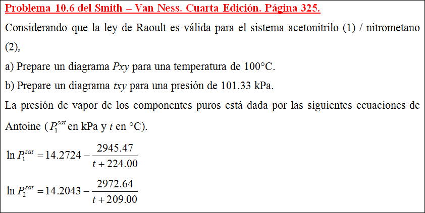 La presión de vapor de los componentes puros está dada por las siguientes ecuaciones de Antoine ( en kPa y t en °C).