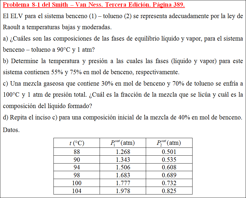 c) Una mezcla gaseosa que contiene 30% en mol de benceno y 70% de tolueno se enfría a 100°C y 1 atm de presión total. ¿Cuál es la fracción de la mezcla que se licúa y cuál es la composición del líquido formado?