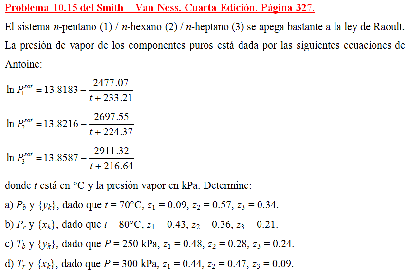 El sistema n-pentano (1) / n-hexano (2) / n-heptano (3) se apega bastante a la ley de Raoult. La presión de vapor de los componentes puros está dada por las siguientes ecuaciones de Antoine: