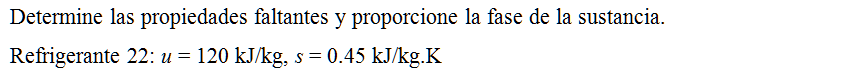 Refrigerante 22: u = 120 kJ/kg, s = 0.45 kJ/kg.K