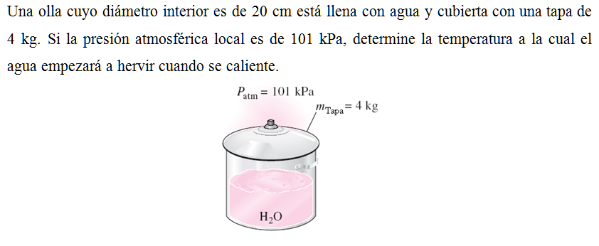 Una olla cuyo diámetro interior es de 20 cm está llena con agua y cubierta con una tapa de 4 kg. Si la presión atmosférica local es de 101 kPa, determine la temperatura a la cual el agua empezará a hervir cuando se caliente.