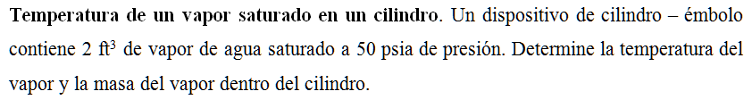 Un dispositivo de cilindro – émbolo contiene 2 ft3 de vapor de agua saturado a 50 psia de presión. Determine la temperatura del vapor y la masa del vapor dentro del cilindro.