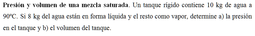 Un tanque rígido contiene 10 kg de agua a 90ºC. Si 8 kg del agua están en forma líquida y el resto como vapor, determine a) la presión en el tanque y b) el volumen del tanque.