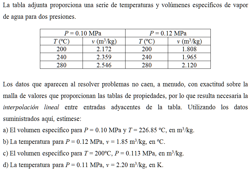 Los datos que aparecen al resolver problemas no caen, a menudo, con exactitud sobre la malla de valores que proporcionan las tablas de propiedades, por lo que resulta necesaria la interpolación lineal entre entradas adyacentes de la tabla. Utilizando los datos suministrados aquí, estímese: