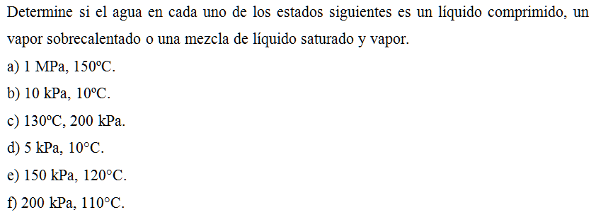Respuesta: a) Líquido comprimido; b) Líquido comprimido; c) Vapor sobrecalentado; d) Líquido comprimido; e) Vapor sobrecalentado; f) Líquido comprimido.