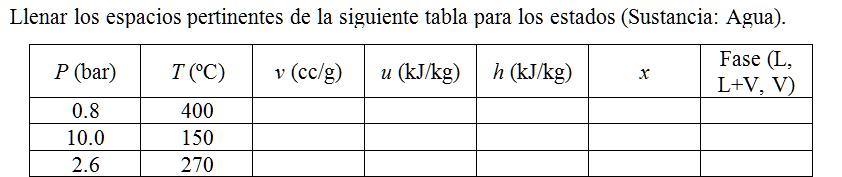 Llenar los espacios pertinentes de la siguiente tabla para los estados (Sustancia: Agua).