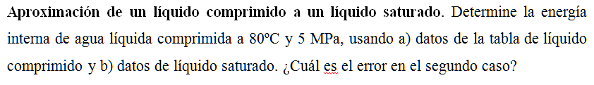 Determine la energía interna de agua líquida comprimida a 80ºC y 5 MPa, usando a) datos de la tabla de líquido comprimido y b) datos de líquido saturado. ¿Cuál es el error en el segundo caso?