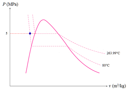 La sustancia se encuentra en un punto sobre la línea horizontal de 5 MPa y sobre la línea de temperatura constante de 80ºC:
