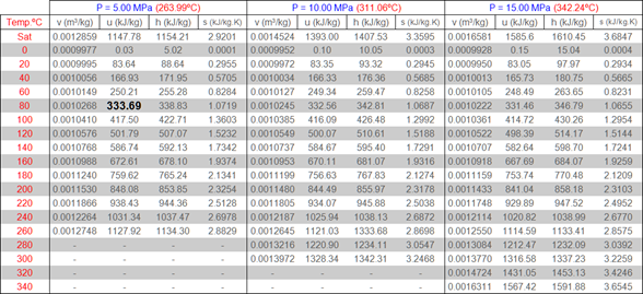 Si fijamos la presión P = 5 MPa, se busca en la tabla de propiedades termodinámicas (TPT) la temperatura de saturación a esta presión: