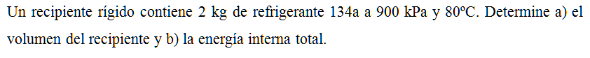 Un recipiente rígido contiene 2 kg de refrigerante 134a a 900 kPa y 80ºC. Determine a) el volumen del recipiente y b) la energía interna total.