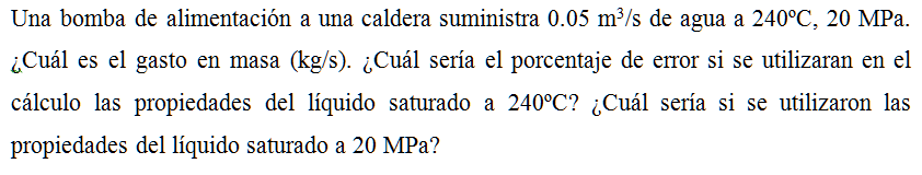 Una bomba de alimentación a una caldera suministra 0.05 m3/s de agua a 240ºC, 20 MPa. ¿Cuál es el gasto en masa (kg/s). ¿Cuál sería el porcentaje de error si se utilizaran en el cálculo las propiedades del líquido saturado a 240ºC? ¿Cuál sería si se utilizaron las propiedades del líquido saturado a 20 MPa?