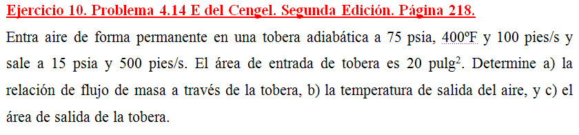 Entra aire de forma permanente en una tobera adiabática a 75 psia, 400ºF y 100 pies/s y sale a 15 psia y 500 pies/s. El área de entrada de tobera es 20 pulg2. Determine a) la relación de flujo de masa a través de la tobera, b) la temperatura de salida del aire, y c) el área de salida de la tobera.