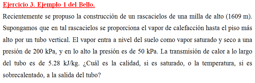 Recientemente se propuso la construcción de un rascacielos de una milla de alto (1609 m). Supongamos que en tal rascacielos se proporciona el vapor de calefacción hasta el piso más alto por un tubo vertical. El vapor entra a nivel del suelo como vapor saturado y seco a una presión de 200 kPa, y en lo alto la presión es de 50 kPa. La transmisión de calor a lo largo del tubo es de 5.28 kJ/kg. ¿Cuál es la calidad, si es saturado, o la temperatura, si es sobrecalentado, a la salida del tubo?