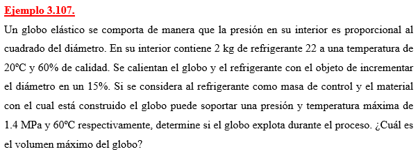 Un globo elástico se comporta de manera que la presión en su interior es proporcional al cuadrado del diámetro. En su interior contiene 2 kg de refrigerante 22 a una temperatura de 20ºC y 60% de calidad. Se calientan el globo y el refrigerante con el objeto de incrementar el diámetro en un 15%. Si se considera al refrigerante como masa de control y el material con el cual está construido el globo puede soportar una presión y temperatura máxima de 1.4 MPa y 60ºC respectivamente, determine si el globo explota durante el proceso. ¿Cuál es el volumen máximo del globo?